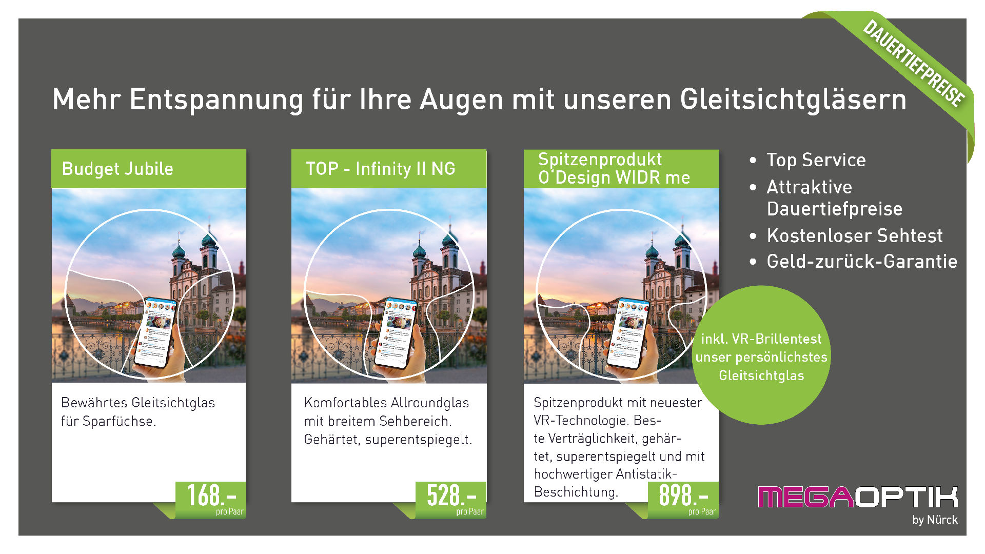 Bei Mega Optik erhalten Sie für jedes Budget Brillengläser. Auch die neusten Glastechnologien können wir Ihnen zu einem Dauertiefpreis anbieten. Gerne beraten wir Sie individuell und finden für Ihre Bedürfnisse das passende Brillenglas.